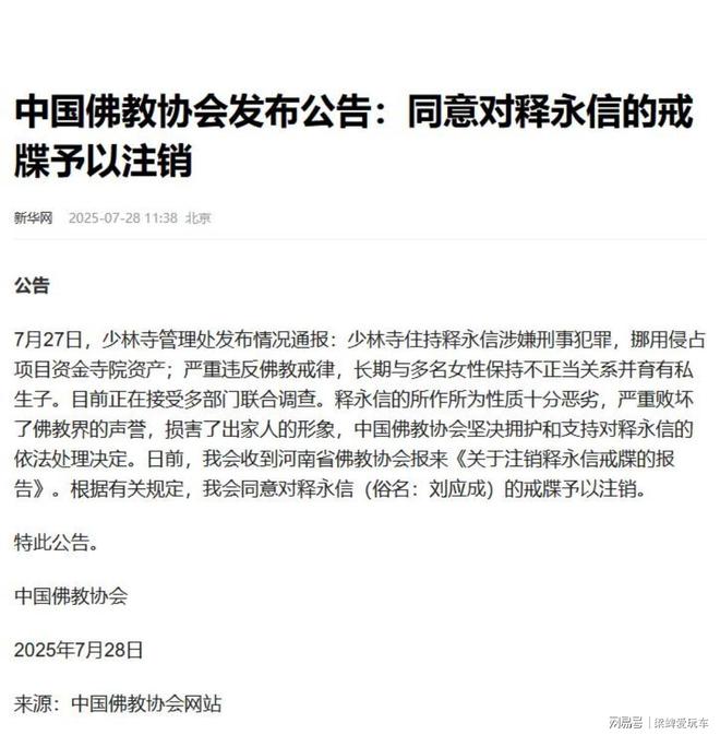 次日,中国佛教协会旋即作出回应,发布公告,表示同意注销释永信(俗名刘应成)的戒牒。